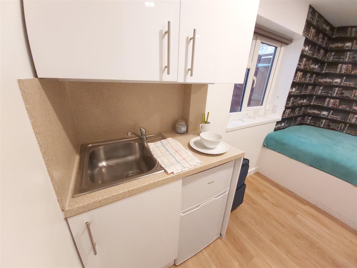 A brand new studio style property consisting of a brand new fitted snack area, an open plan dining/living area and a smart fitted self-contained bath or shower room. This spacious accommodation is fully double glazed and furnished with student essentials, including a double bed, study desk and chair, storage, flat-screen TV, low-noise white goods, and more.